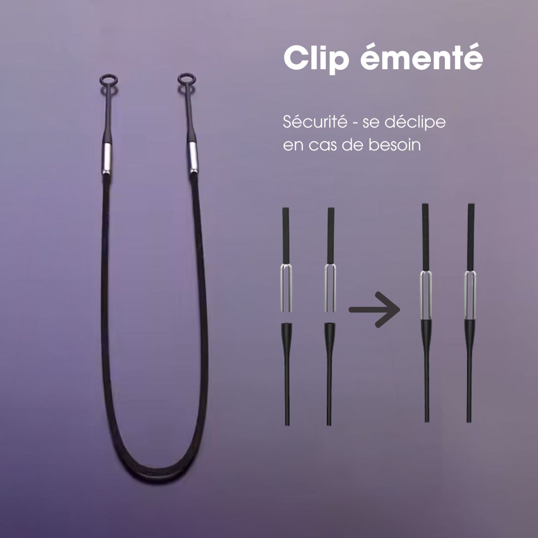 Section en silicone souple, système métallique à clipser, finition textile en polyester.