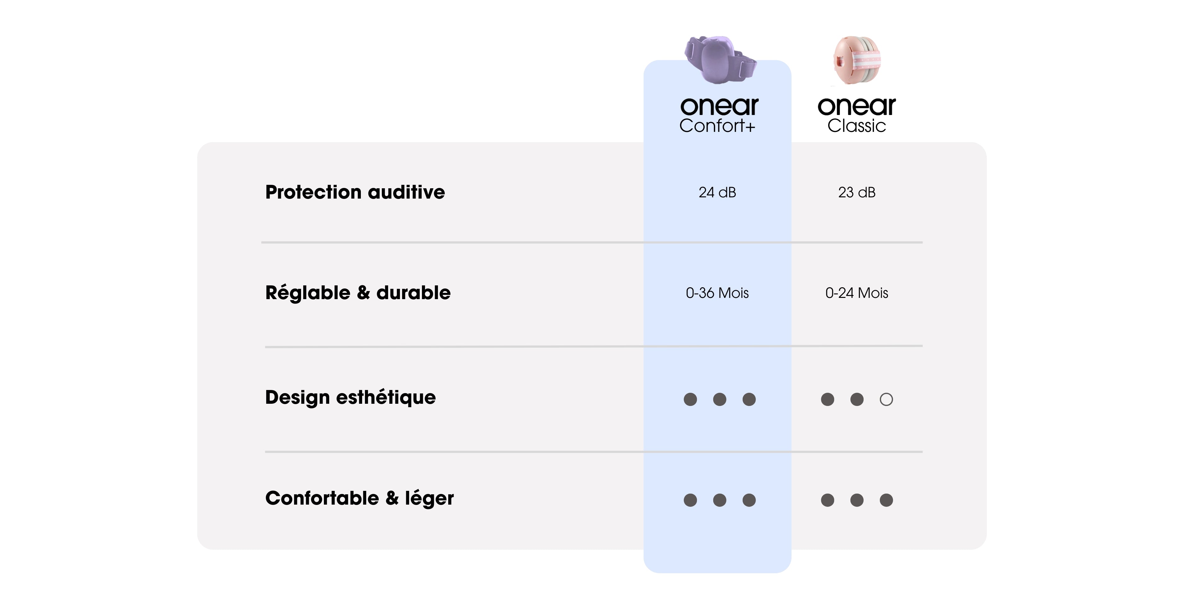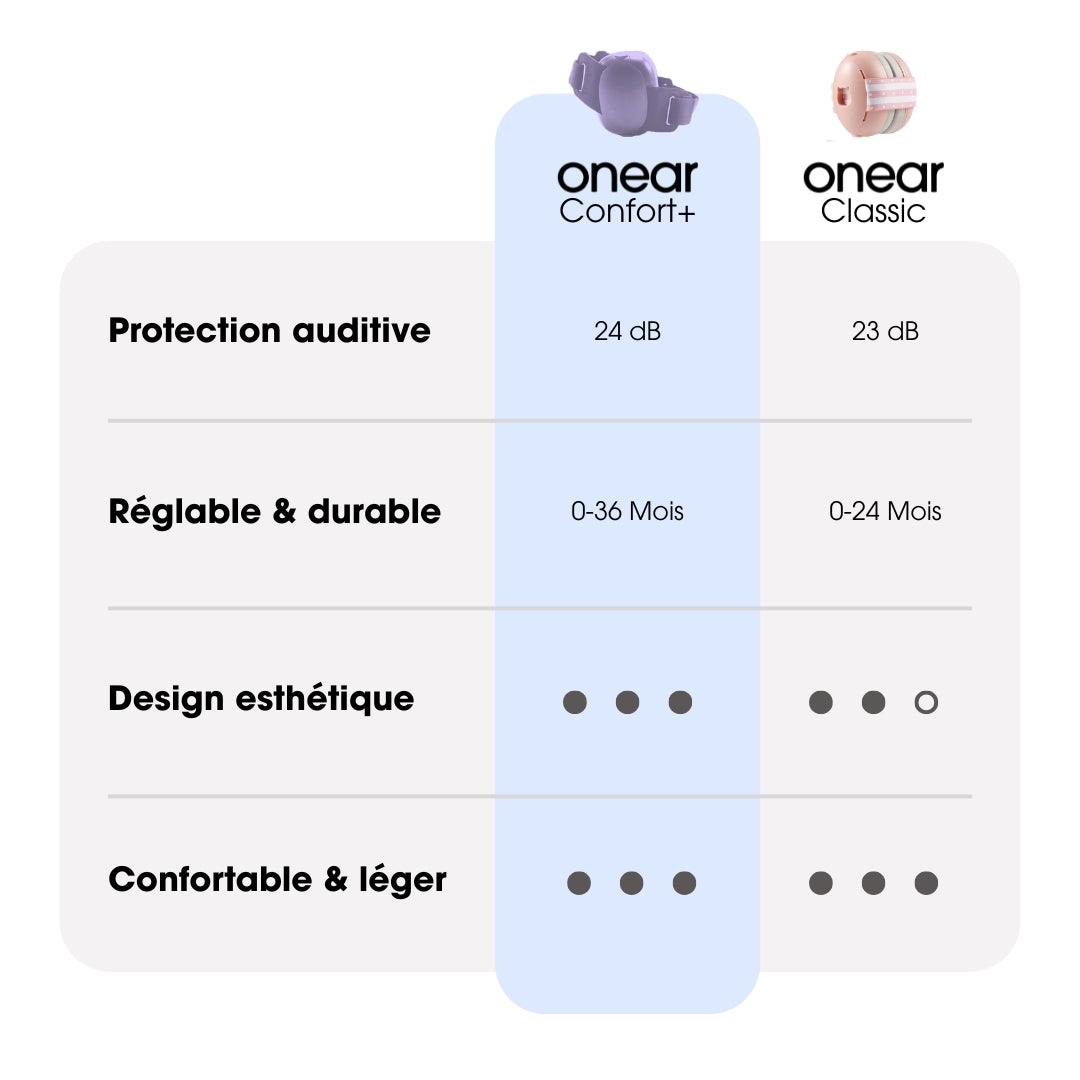 Les protections Onear Classique conviennent dès la naissance (0 mois) jusqu'à 24 mois.